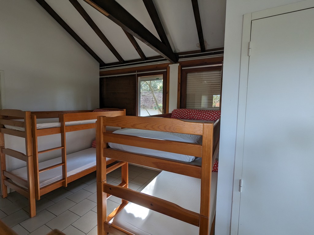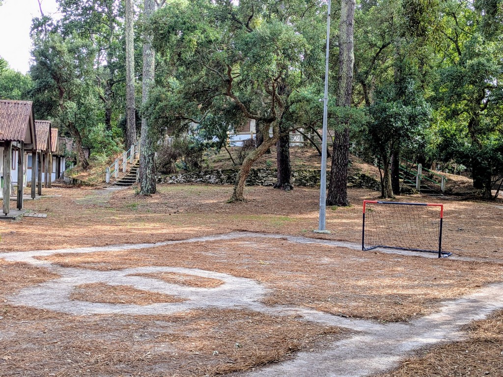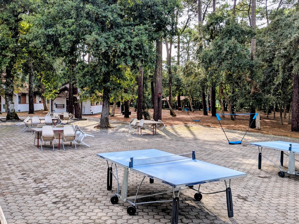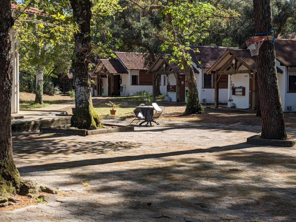 11 bungalows y 4 salas polivalentes en un gran parque arbolado con zonas de juego (ping-pong, tiro con arco, bádminton, voleibol, baloncesto, etc.).