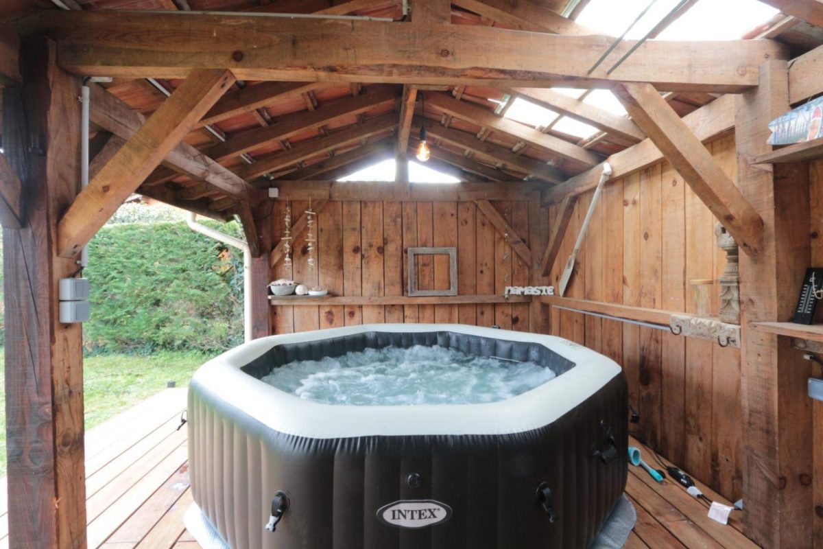 Le encantará la hermosa terraza de madera, parcialmente cubierta por un cobertizo, donde podrá disfrutar de sus comidas al aire libre en cualquier época del año (muebles de jardín de madera exótica, barbacoa, tumbonas). En los días soleados, también podrá disfrutar de un jacuzzi hinchable Intex privado, protegido por un toldo, con vistas al jardín arbolado sin obstáculos.
