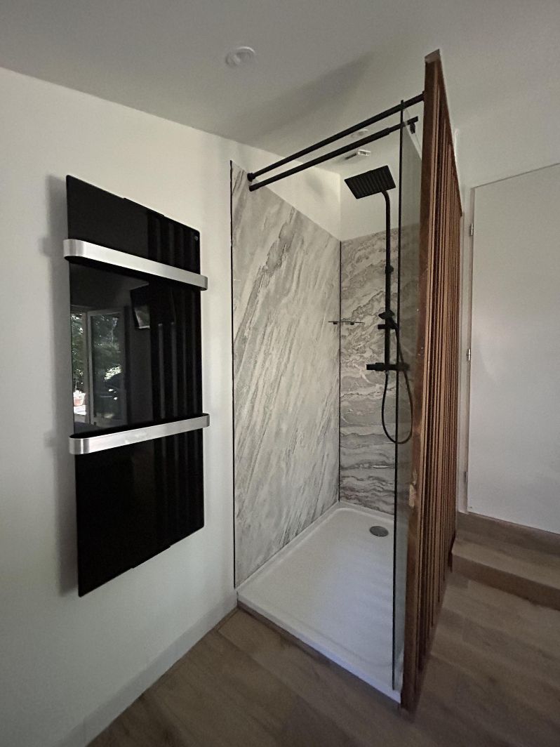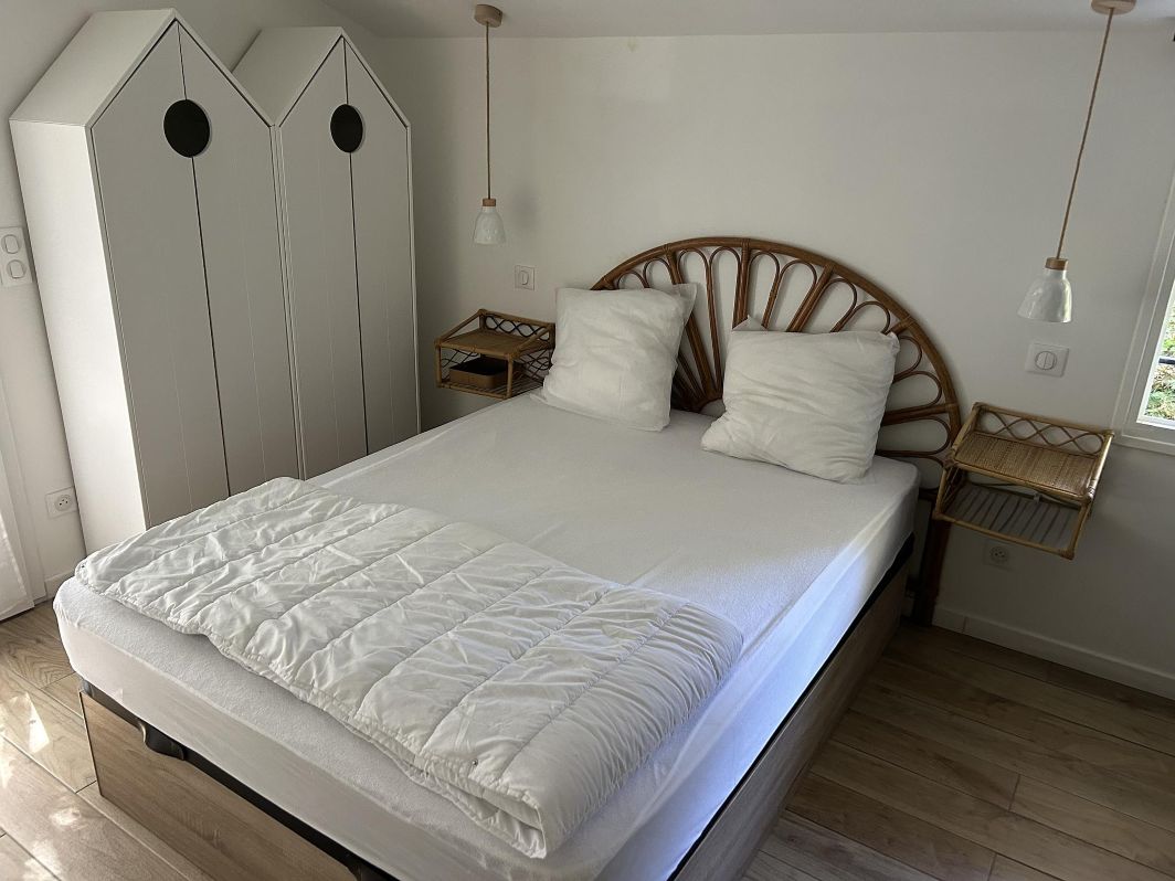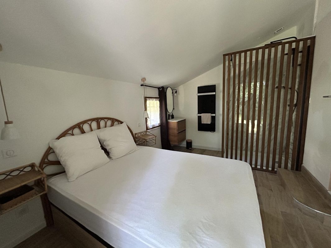 -1 dormitorio con cama de matrimonio (140), ducha y lavabo.