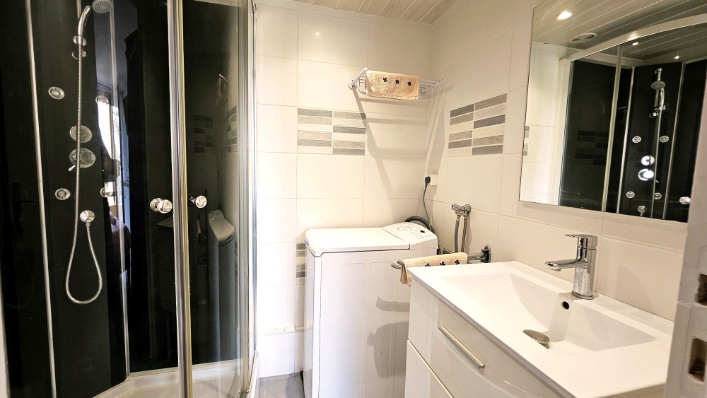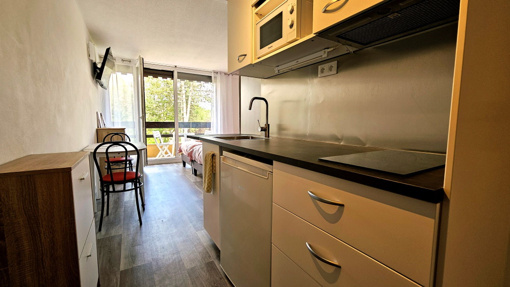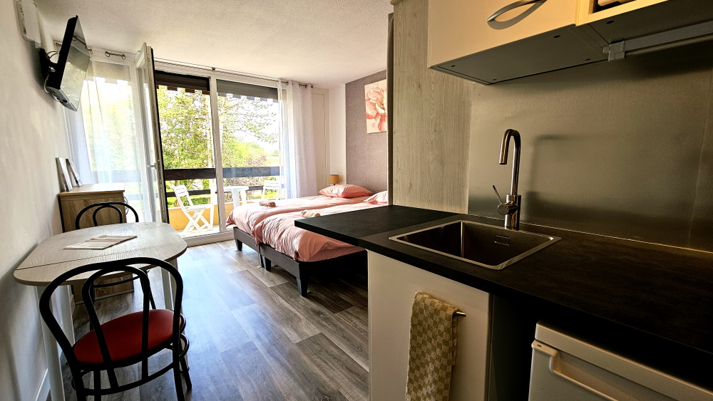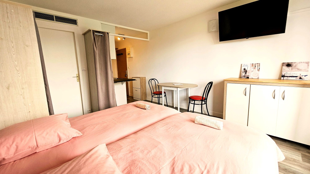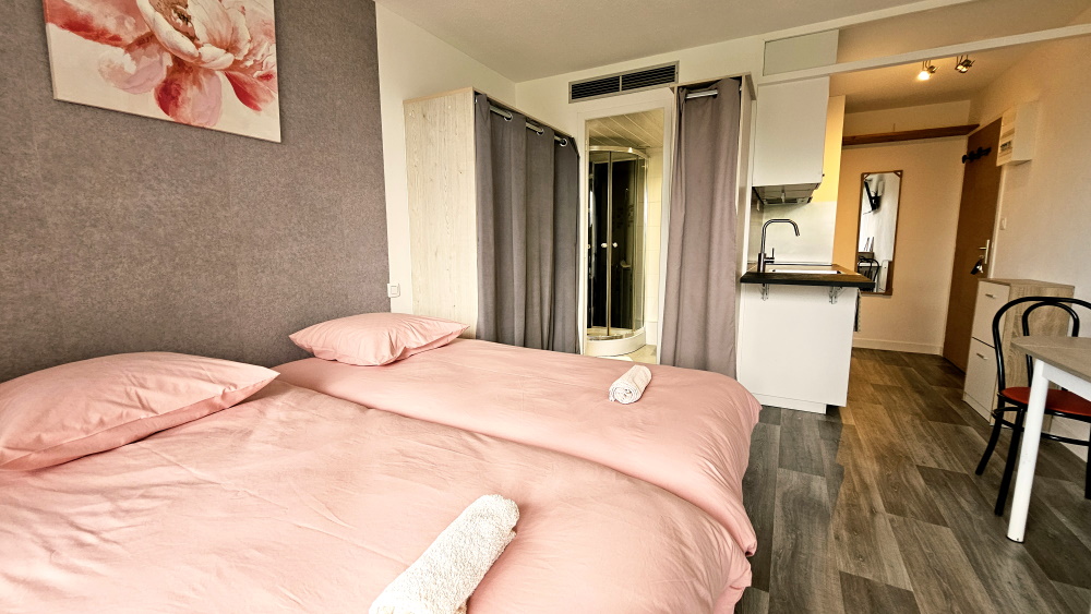 El estudio consta de una habitación principal con dos camas, una cocina americana totalmente equipada, un aseo separado y un cuarto de baño con ducha y lavadora.