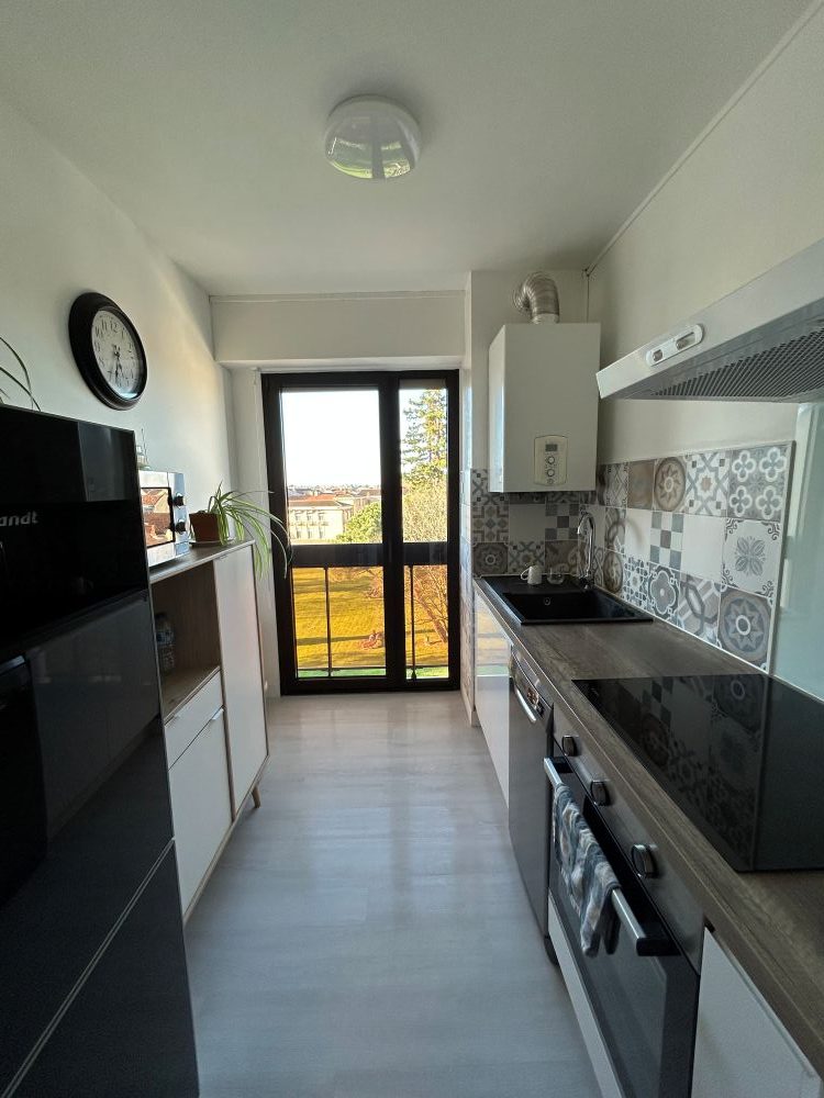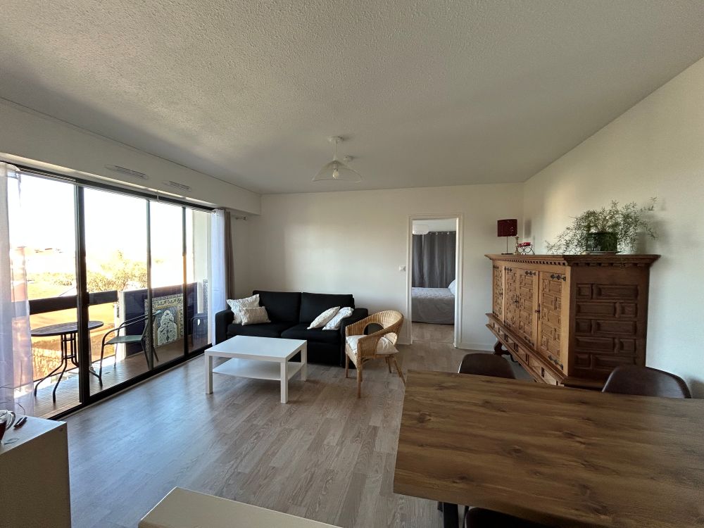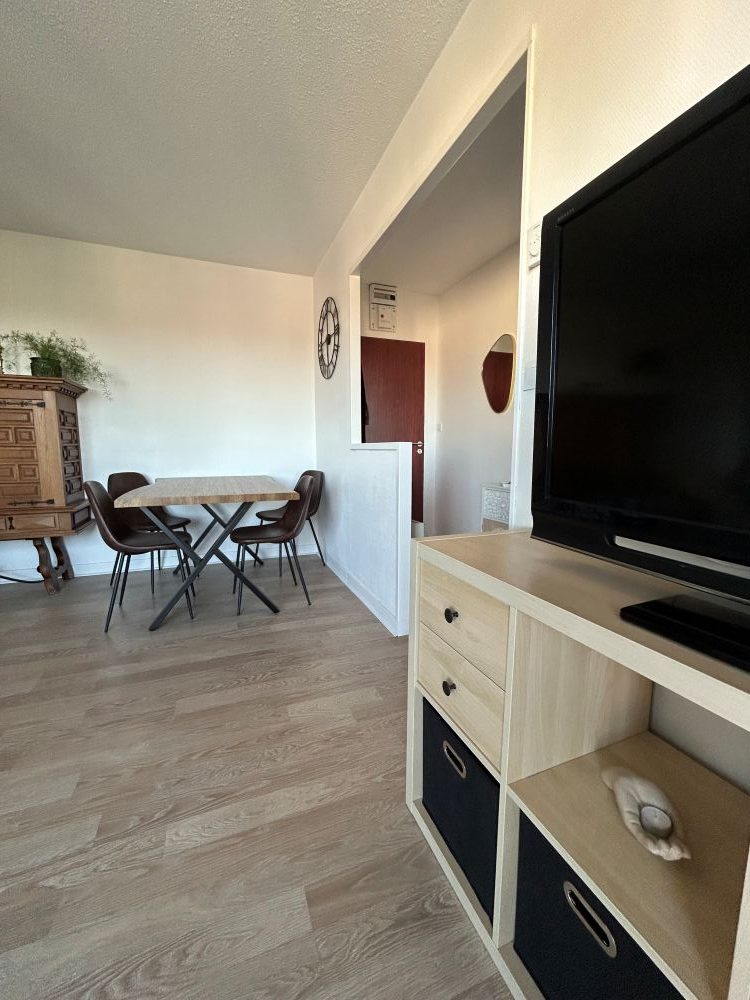 Situado en una residencia en la 5ª planta con ascensor, este apartamento luminoso y bien equipado dispone de una agradable sala de estar, una cocina totalmente equipada con lavavajillas, dos habitaciones confortables: una con cama doble (160 cm) y la segunda con cama individual (140 cm); práctico espacio de almacenamiento para una estancia cómoda. Cuarto de baño con ducha, lavadora y secadora. WC separado.