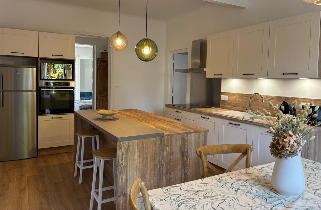 Ideal para vacaciones en familia o con amigos, puede alojar hasta 8 personas en un entorno cómodo y relajante (6 adultos, 2 niños). Una amplia sala de estar de planta abierta, que comprende un acogedor salón, una cocina contemporánea totalmente equipada con una isla central de convivencia, y un acogedor comedor.